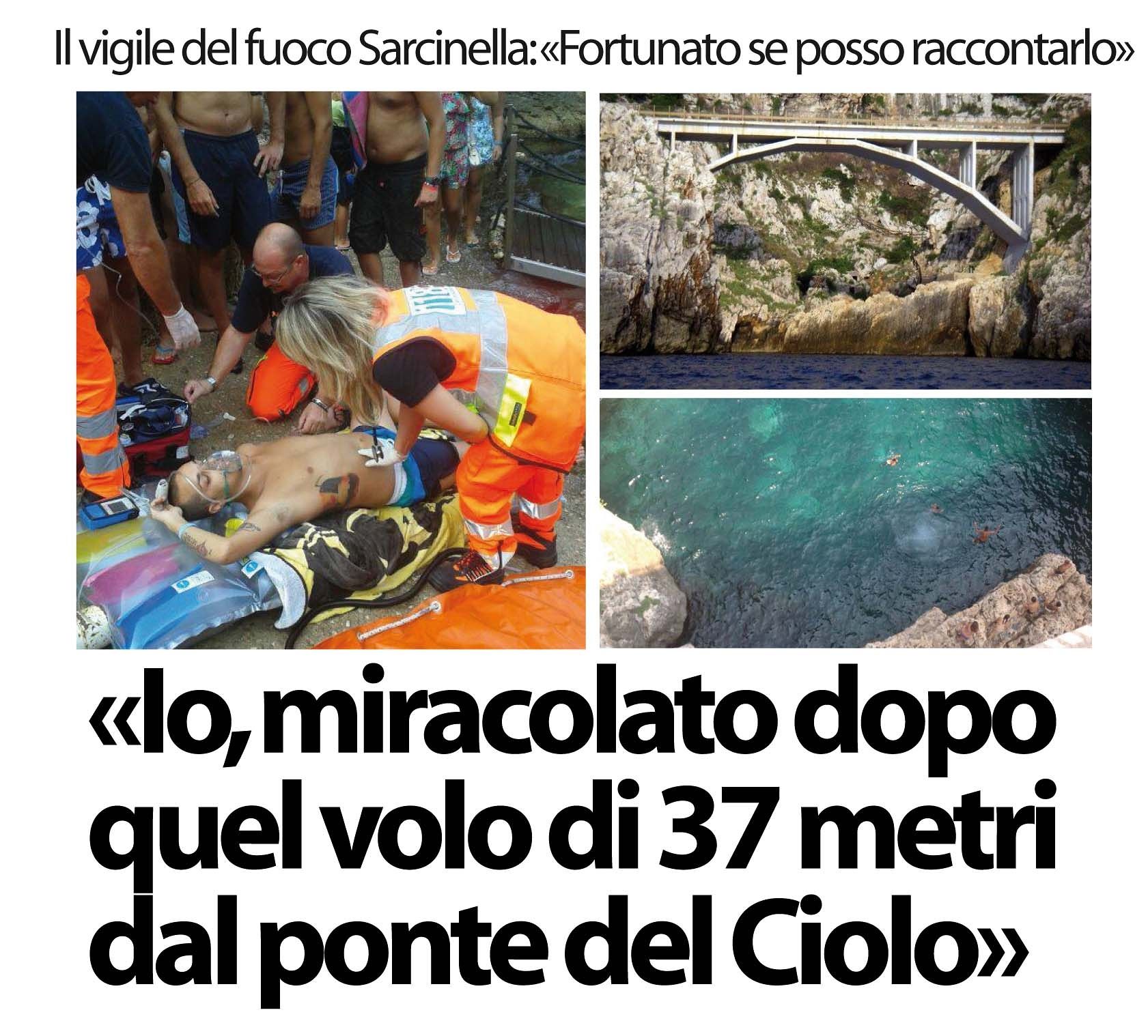 BRINDISI – E’ stato considerato dai medici “miracolato”, Donato Sarcinella 27enne di Brindisi, vigile del fuoco, quando è giunto all’ospedale di Tricase il 15 agosto scorso con un’embolia polmonare dopo essersi tuffato dal ponte del Ciolo (località turistica a pochi chilometri da Santa Maria di Leuca) da un’altezza di quasi 40 metri. “Qualcuno mi ha aiutato, perché diversamente sarei morto”.