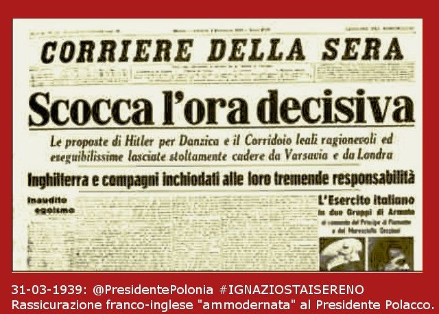 Se fossimo stati ai nostri giorni, si potrebbe dire che fu lanciato un hashtag franco-inglese: #edvardstaisereno (dove Edvard sta per il nome di battesimo del presidente della repubblica cecoslovacca Edvard Beneš. Il 21 settembre 1938 la Cecoslovacchia capitolò e Hitler tre giorni dopo, chiusa la “pratica”, proseguì con l’avanzare ulteriori richieste annessionistiche, prima fra tutte, quella di riprendersi la città polacca di Danzica. Era un venerdì quel 31 marzo 1939, esatti 75 anni fa, quando ancora loro, il primo ministro di sua maestà britannica e il prino ministro francese lanciarono un altro hashtag, questa volta indirizzato al presidente della repubblica polacca Ignacy Mościcki #ignaziostaisereno e anche questa volta il risultato si è ripetuto: il primo settembre 1939 le truppe tedesche invadono la Polonia ed il presidente Moscicki, e buona parte del suo popolo, vanno in esilio.