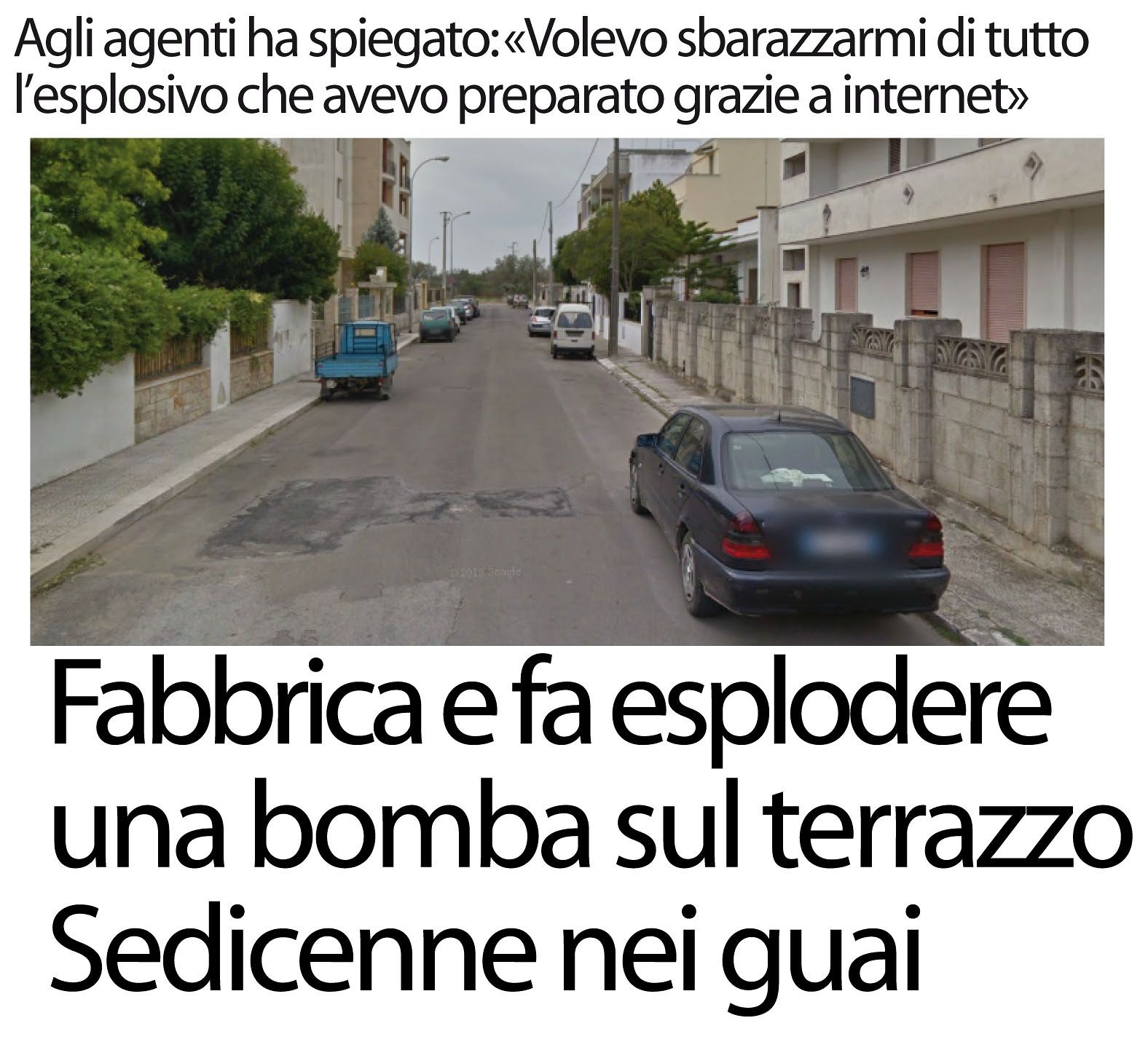 Sperava forse in una deflagrazione più contenuta. Ma si sbagliava. L’esplosione avvertita domenica sera in via Buozzi a Mesagne di un ordigno fabbricato in casa da un 16enne col bernoccolo per i “botti”, si è rivelata di gran lunga più potente di quanto preventivato. Tanto, da gettare nel panico l’intero quartiere Seta e richiedere l’intervento della Polizia. Agli agenti del commissariato di Mesagne che lo hanno subito individuato, il giovane autore della bravata, E. S., ha spiegato di aver trovato le istruzioni sul web e di aver fatto deflagrare sul terrazzo di casa il materiale esplodente raccolto in una scatola, al solo scopo di disfarsene. Ma non si aspettava una simile esplosione. Scuse e giustificazioni che non gli hanno tuttavia evitato la segnalazione al tribunale dei minori di Lecce per detenzione e fabbricazione di congegni esplosivi.