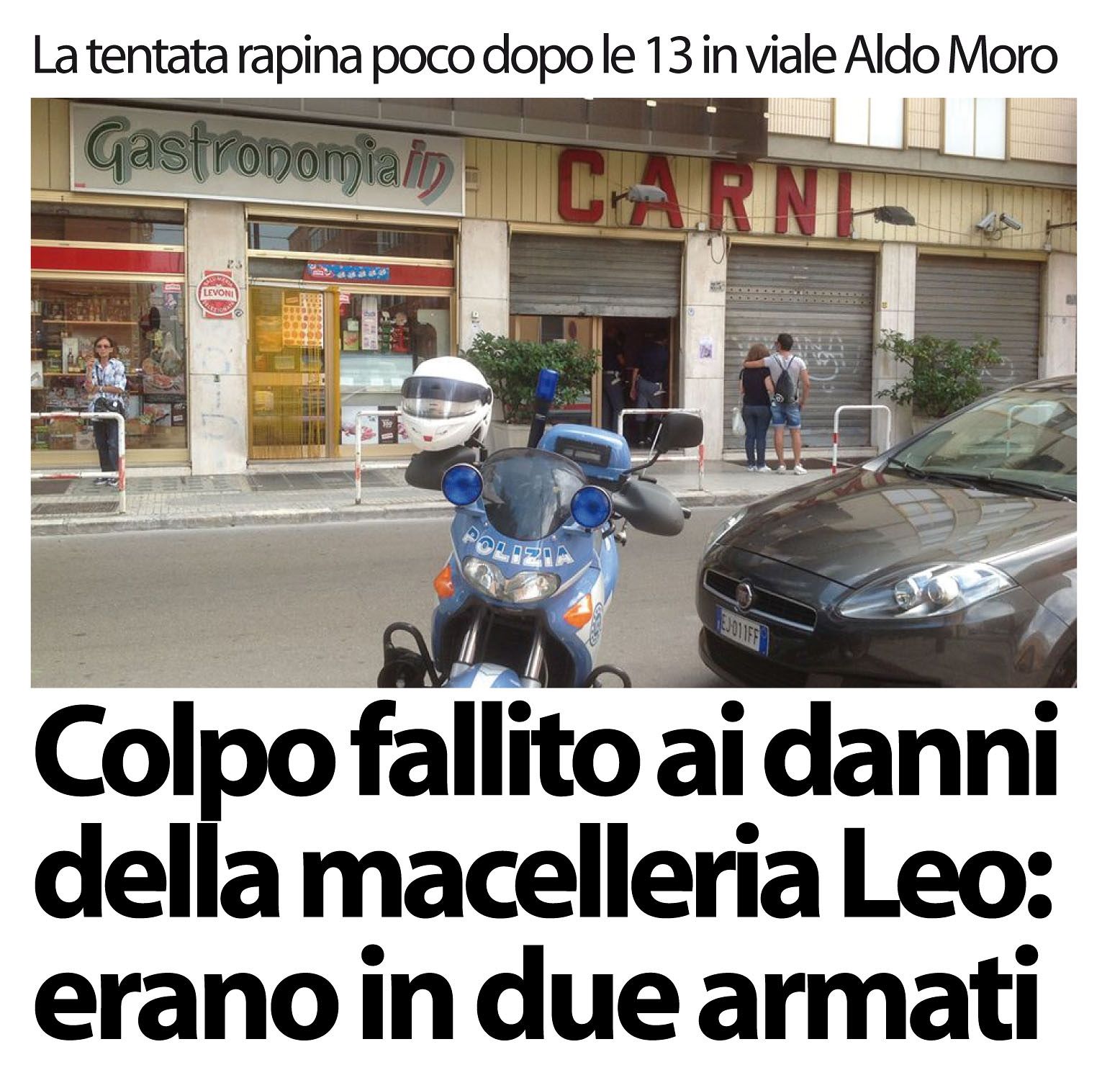 Tentata rapina poco fa, intorno alle ore 13, ai danni della macelleria Leo, in viale Aldo Moro 83. Stando a una prima ricostruzione, gli autori del colpo sono due, di giovane età, fuggiti a bordo di uno scooter nero verso il quartiere Bozzano. Molto probabilmente i due malviventi erano armati di pistola.
