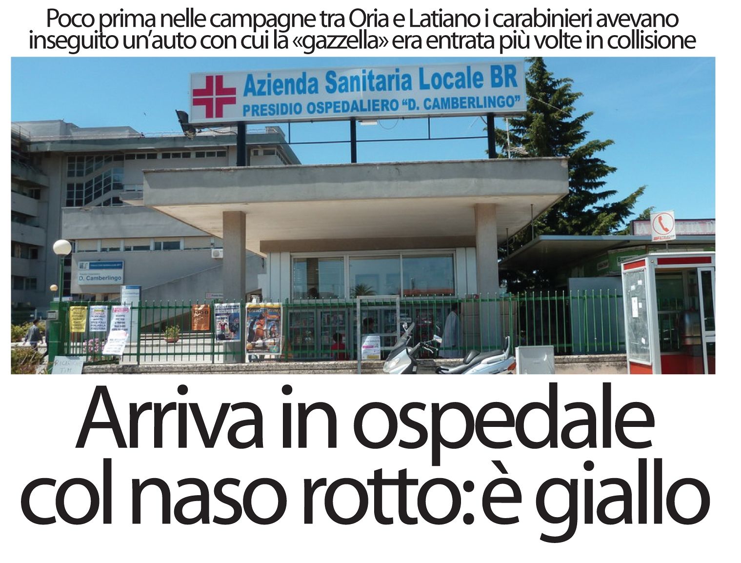Un uomo la notte scorsa è arrivato al pronto soccorso dell’ospedale Camberlingo di Francavilla Fontana con una ferita sul viso dichiarando di essersi fatto male accidentalmente ma poco dopo a prelevarlo sono giunti i carabinieri. Pare alcuni minuti prima ci fosse stato un inseguimento nelle campagne tra Latiano e Oria tra una pattuglia dei militari dell’Arma e un’auto con a bordo due uomini. Le vetture si sarebbero urtate più volte. Poi i fuggitivi avrebbero fatto perdere le proprie tracce fra le stradine di campagna. Molto probabilmente l’uomo ferito giunto al nosocomio francavillese è proprio uno dei due che si trovava in auto. Aveva il setto nasale rotto: dopo le medicazioni non è stato necessario il ricovero. Aggiornamenti a breve su www.senzacolonnenews.it