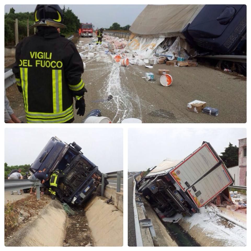 Un tir che trasportava vernici si è ribaltato pochi minuti fa sulla complanare della statale 379, nei pressi di Apani, in direzione Brindisi. Il conducente, nel tentativo di accostare il tir, è finito con il mezzo in un canale pluviale che costeggia la strada. Centinaia di barattoli di vernice si sono riversati sull’asfalto. Il pronto intervento dei vigili del fuoco ha evitato che si sviluppasse un incendio che poteva avere conseguenze devastanti vista l’alta infiammabilità del carico. Una volta messa in sicurezza la zona sono stati chiamati i tecnici dell’Arpa per verificare la situazione per la presenza di materiale altamente inquinante. Il conducente del tir è uscito praticamente illeso ma sotto choc.