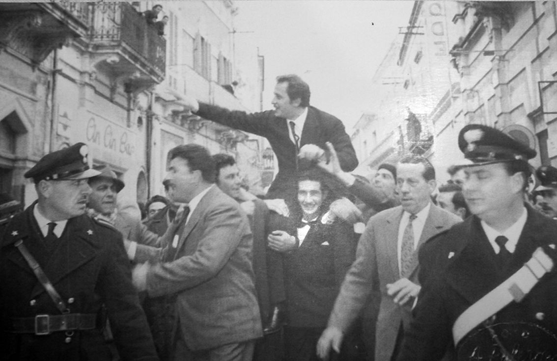 (Nella foto, Modugno viene portato in trionfo a San Pietro Vernotico dopo la vittoria al Festival di Sanremo)