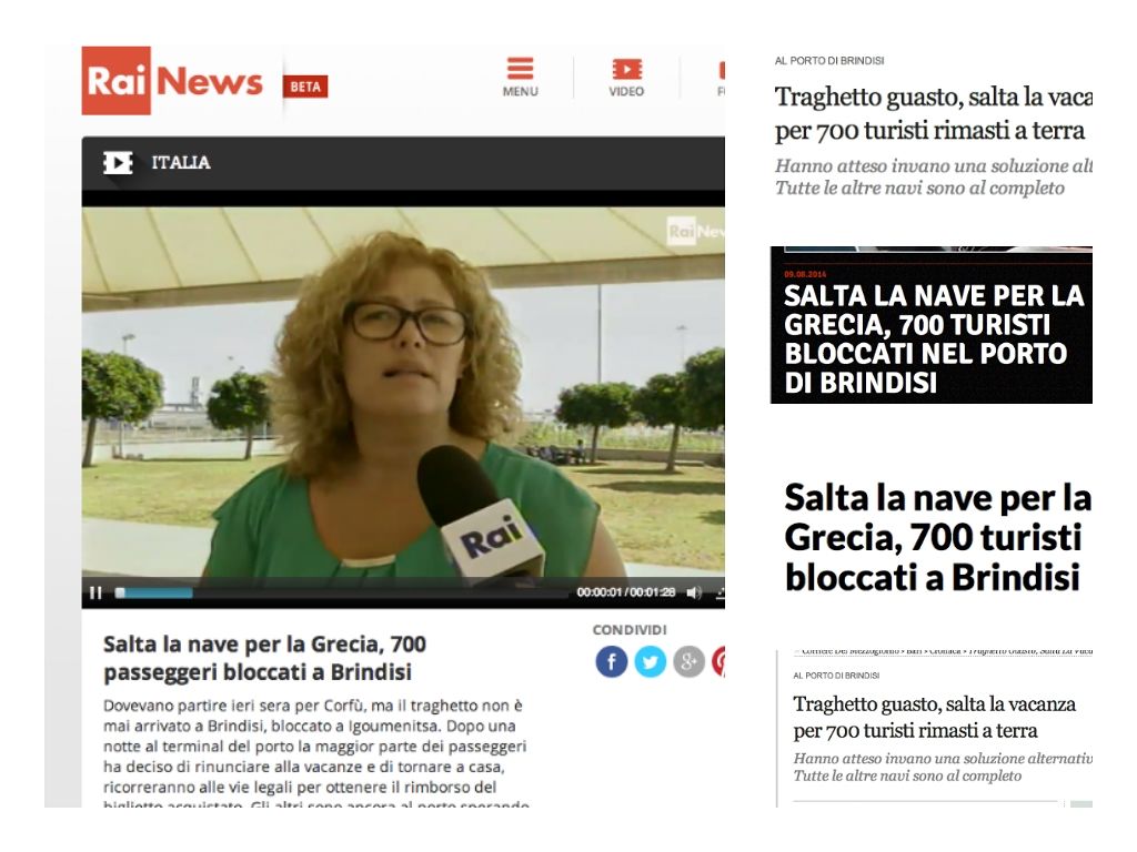 Ma al di là dei danni gravissimi provocati a queste famiglie la cui vacanza è stata cancellata, ve n’è uno ancora più grave per l’immagine del porto di Brindisi che lentamente stava cercando di riaffermarsi e di riacquisire quel ruolo di testa di ponte per la Grecia che aveva detenuto per tutto il secolo scorso. Tutta la stampa nazionale, e nella foto abbiamo estratto solo qualcuno delle decine di titoli comparsi oggi sui siti web ma immaginiamo che domani ce ne saranno altrettanti sui giornali, parla del disastro di Brindisi. E ovviamente nei titoli non c’è il nome della compagnia armatrice del traghetto-carretta, ma quello di Brindisi. A questo è lecito porsi due domande: la prima, chi ripagherà le centinaia di famiglie rimaste a terra e non solo dei biglietti e delle prenotazioni alberghiere già anticipate, ma per lo stress, l’ansia e la rabbia? Seconda, ancora più importante, chi ripagherà Brindisi del danno gravissimo che è stato perpetrato alla sua immagine?