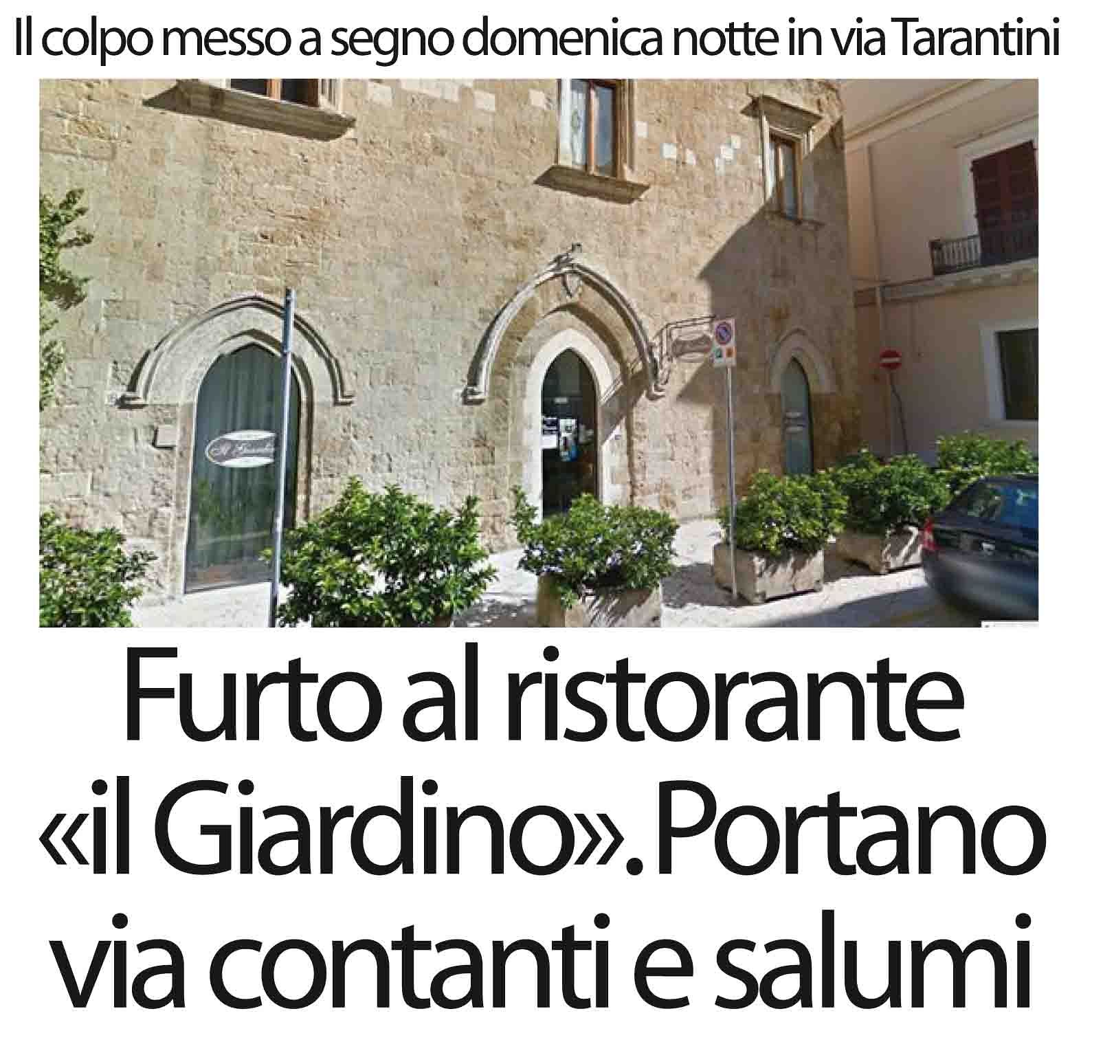 BRINDISI – Rompono la porta in vetro dell’ingresso, s’introducono nel ristorante “Il Giardino” in via Tarantini Giovanni, in pieno centro, a Brindisi, tagliano la cassaforte e i malviventi si portano via 800 euro in contanti oltre ad appropriarsi di salumi, formaggi, melanzane e zucchine. Il furto è avvenuto la notte fra domenica e lunedì scorsi e ad accorgersi del danno è stato il proprietario Raffaele Nobile all’indomani mattina, lo stesso che ha richiesto l’intervento di una volante della polizia per segnalare l’accaduto.