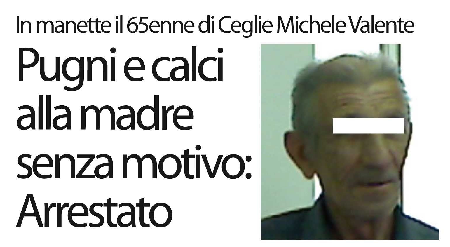 Calci e pugni all’anziana madre senza un motivo e così Michele Valente 65enne di Ceglie Messapica è stato arrestato dai carabinieri per maltrattamenti in famiglia. L’uomo, incensurato, è stato rinchiuso nel carcere di Brindisi a disposizione dell’autorità giudiziaria. La donna ha riportato, invece, ferite guaribili in cinque giorni.
