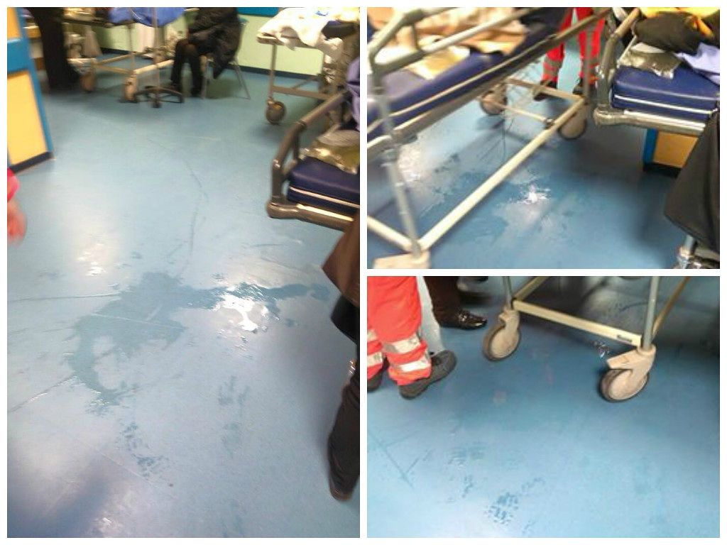 Le foto che vedete ci sono state inviate pochi minuti fa via whatsapp da una donna brindisina che si trova al pronto soccorso dell’ospedale Perrino e che ci segnala la presenza di urina sul pavimento, fuoriuscita dal catetere di un paziente, e che è lì per terra da oltre un’ora. Senza che nessuno si preoccupi di pulire e anzi con le barelle e gli infermieri che ci passano sopra. Una signora incinta di sei mesi e mezzo è al pronto soccorso con il marito il quale lamenta dolori forti al cuore e bruciore. E attende da tre ore di essere visitato. Davanti a una pozzanghera di urina.