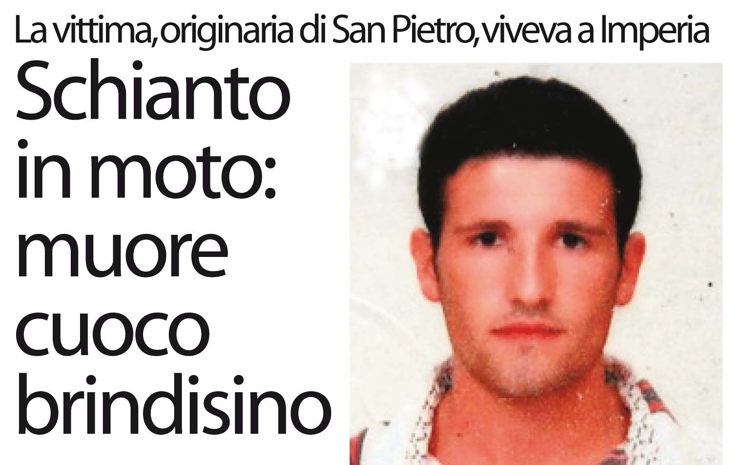 Un cuoco di 23 anni originario di Brindisi, Francesco Di Paola Picca, è morto in un incidente in moto avvenuto stamattina sull’Aurelia a Ospedaletti a Imperia. Il giovane era in sella alla sua moto di grossa cilindrata, quando per cause ancora al vaglio della polizia, ha perso il controllo e si è schiantato contro un’auto.
