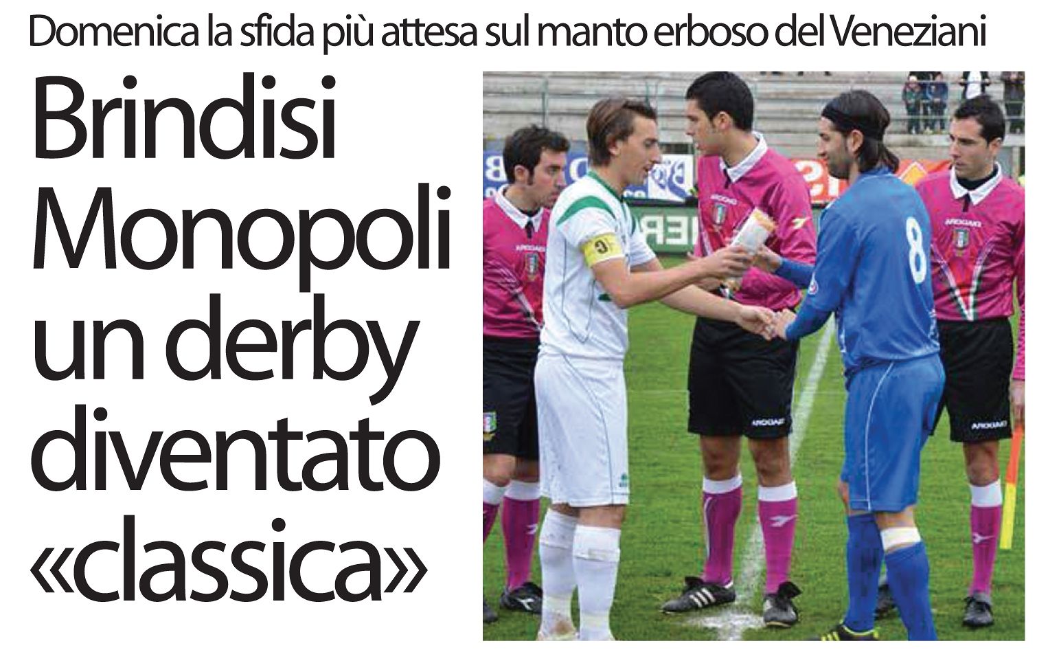 Sono lontanissimi i tempi in cui il Grande Brindisi di Franco Fanuzzi utilizzava biancoverdi monopolitani come sparring partner per le partitelle di allenamento infrasettimanali prima di affrontare Parma, Genoa, Atalanta, Lazio Inter o Milan ed oggi, infatti, Monopoli-Brindisi è una classica della categoria, molto sentita, checché se ne dica, anche dalla tifoseria biancazzurra, specialmente a far data dalla stagione 2004/05, quando le due formazioni diedero vita ad uno strepitoso campionato di Eccellenza totalizzando oltre 200 punti in due e giungendo entrambe al sospirato salto di categoria; i biancoverdi attraverso la porta principale della vittoria del campionato, i biancazzurri attraverso la finestrella dei play off interregionali.