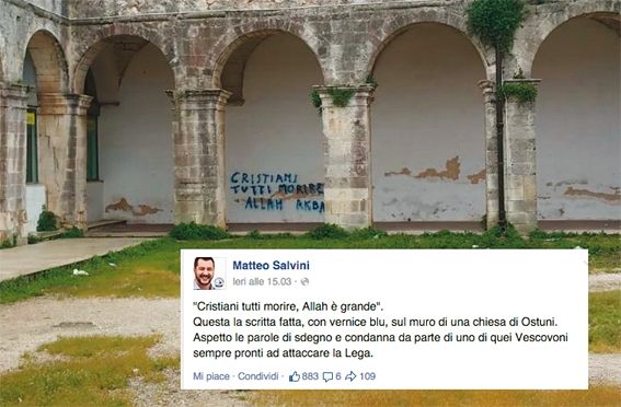 “Cristiani tutti morire, Allah è grande. Questa la scritta fatta, con vernice blu, sul muro di una chiesa di Ostuni. Aspetto le parole di sdegno e condanna da parte di uno di quei Vescovoni sempre pronti ad attaccare la Lega”, scrive su Twitter e Facebook Salvini.