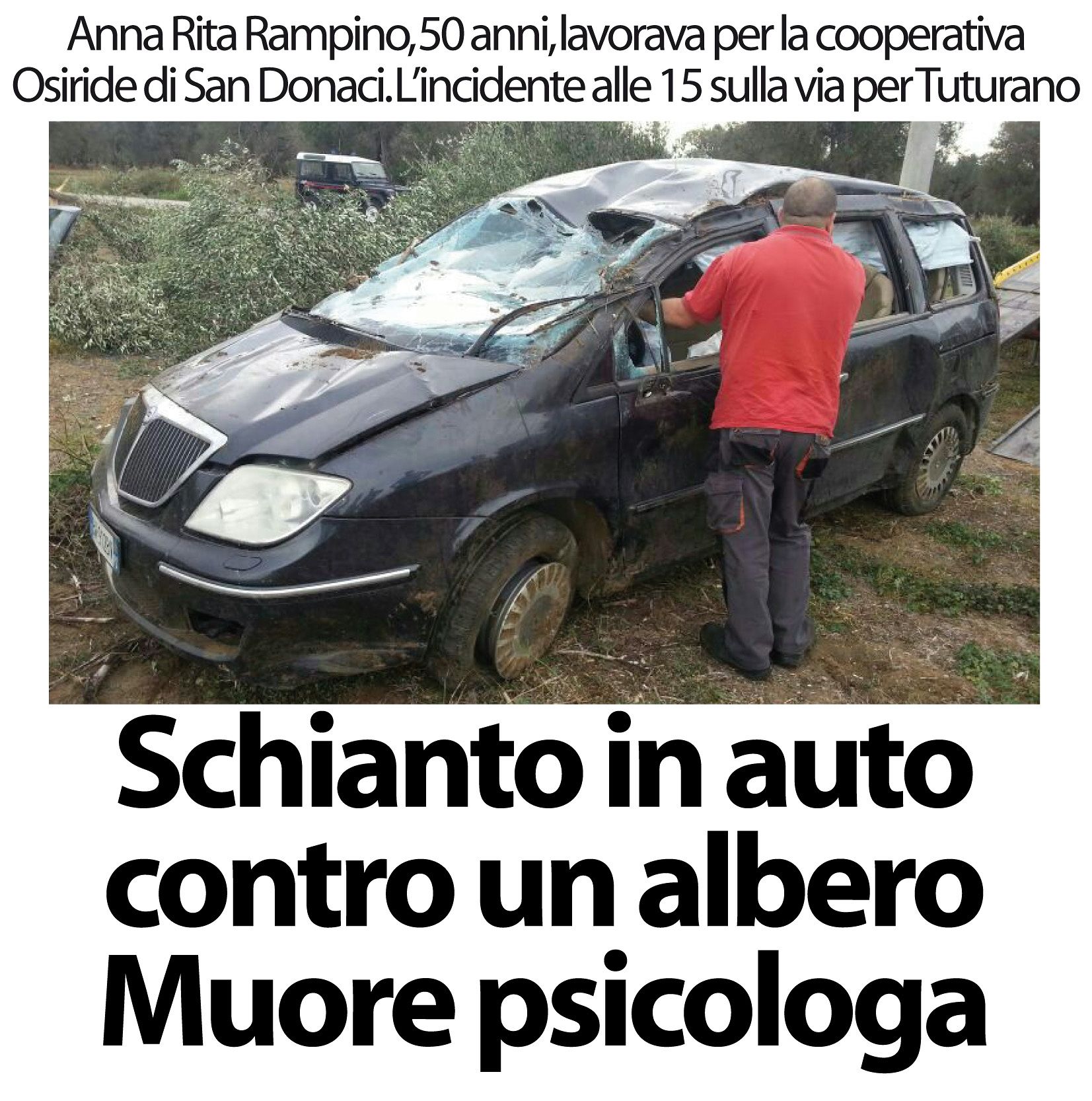 Tragico incidente questo pomeriggio, poco dopo le 15, sulla strada provinciale San Donaci Tuturano: a perdere la vita la psicologa Annarita Rampino di 50 anni. La donna, per cause ancora in fase di accertamento, ha perso il controllo della sua auto ed è andata a schiantarsi contro un albero di ulivo dopo essersi ribaltata più volte.