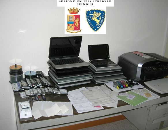 Nel corso di alcune perquisizioni, gli investigatori hanno rinvenuto e sequestrato computer fissi, portatili, hard disk, stampanti sofisticate, scanner e supporti informatici per produrre la falsa documentazione. Nonché tagliandi di revisione in bianco (falsificati in più di un’occasione dal titolare dell’autoscuola per attestare la revisione dei veicoli in realtà mai avvenuta) e alcuni iphone di dubbia provenienza.
