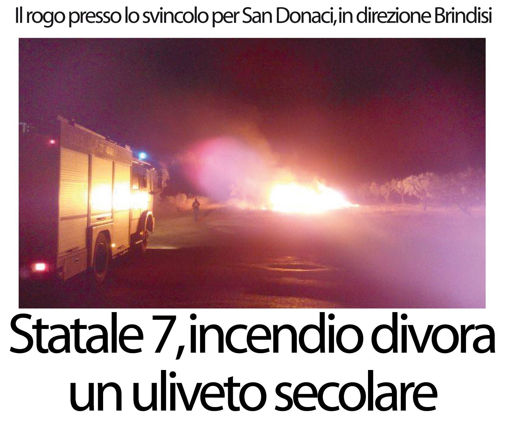 Un incendio di vaste dimensioni ha distrutto sei alberi, ieri sera, in un uliveto secolare nei pressi dello svincolo per San Donaci, sulla strada statale 7 in direzione Brindisi. E’ stato lo stesso proprietario a chiamare i vigili del fuoco poiché dopo aver bruciato alcuni cumuli di sterpaglie ha perso il controllo della situazione e le fiamme hanno lambito anche gli alberi d’ulivo. Sul posto, oltre ai pompieri di Brindisi, si sono recati anche gli uomini della Guardia di Finanza e i carabinieri.
