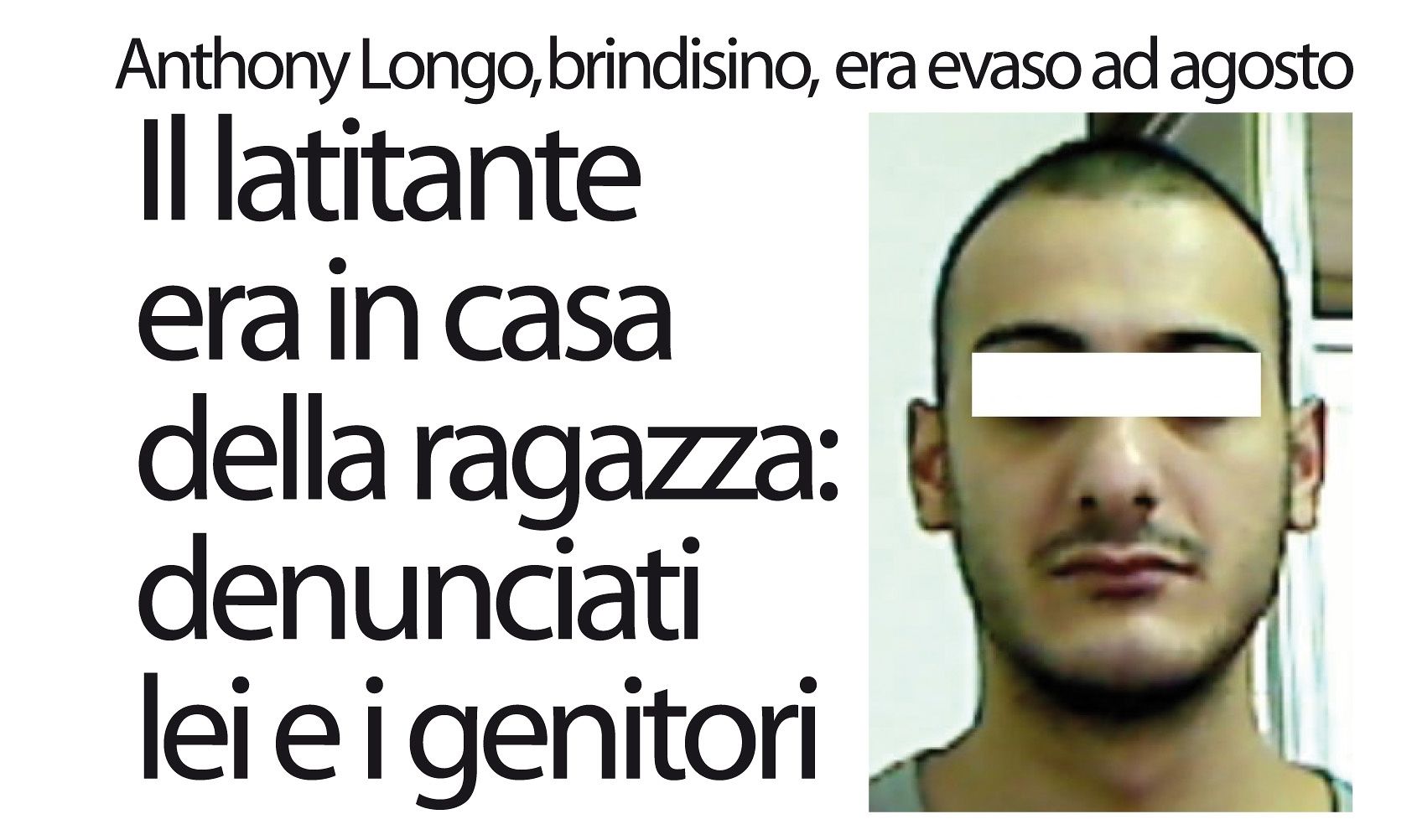 Era evaso lo scorso agosto dalla comunità protetta “Airone” di Trepuzzi, dove stava scontando in regime di arresti domiciliari una condanna a 5 anni di reclusione per concorso in estorsione. Una latitanza di quasi due mesi quella di Anthony Longo, brindisino di 23 anni, interrotta questa mattina dai carabinieri della compagnia di San Vito dei Normanni che lo hanno stanato nell’abitazione dei genitori della sua ragazza, a pochi passi dal tribunale di Brindisi. Una “protezione” che ora rischia di costare caro alla compagna del giovane, M. L. di 18 anni, al padre V. L. di 62 anni e alla madre R. V. di 58 anni, denunciati in stato di libertà con l’accusa di favoreggiamento.