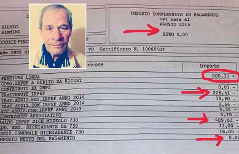 L’Inps ha deciso che il signor Simmini per trenta giorni deve campare senza soldi perché fra trattenute Irpef e saldi dichiarazione 730 al pensionato vengono sottratti tutti gli 800 euro per campare.
