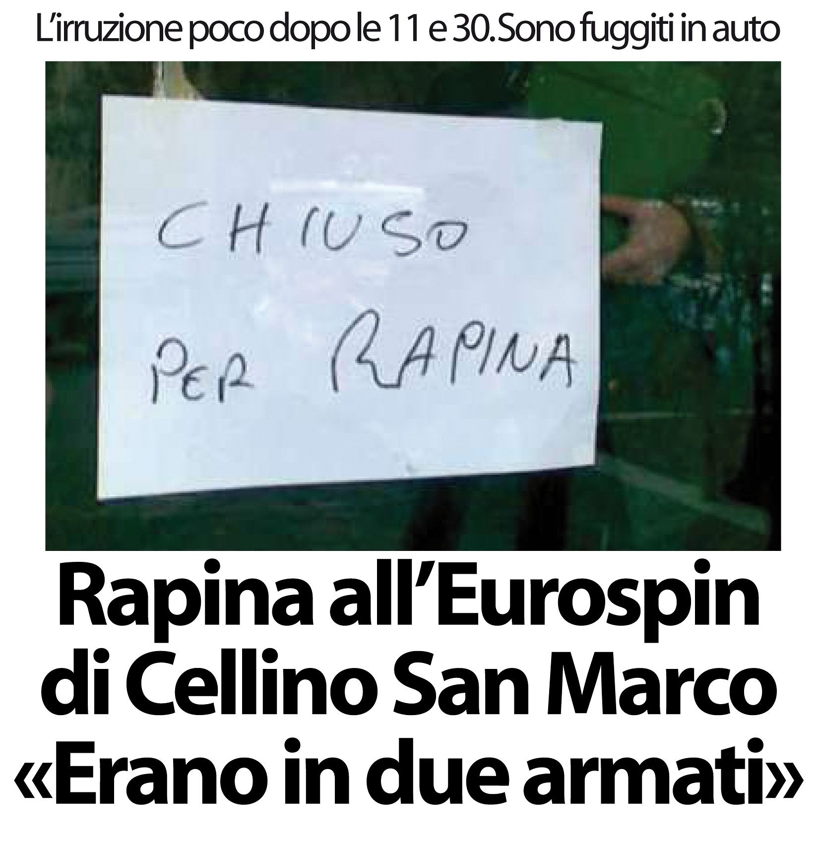 Rapina a mano armata poco dopo le 11.30 di questa mattina all’Eurospin di Cellino San Marco, in via Trieste. Due uomini armati di fucile hanno fatto irruzione nel supermercato minacciando cassiere e clienti. Svuotati i registratori di cassa, i due sono fuggiti a bordo di un’auto di colore grigio, alla guida della quale c’era probabilmente un terzo complice ad attenderli. Sul posto, i carabinieri della stazione di Cellino San Marco.