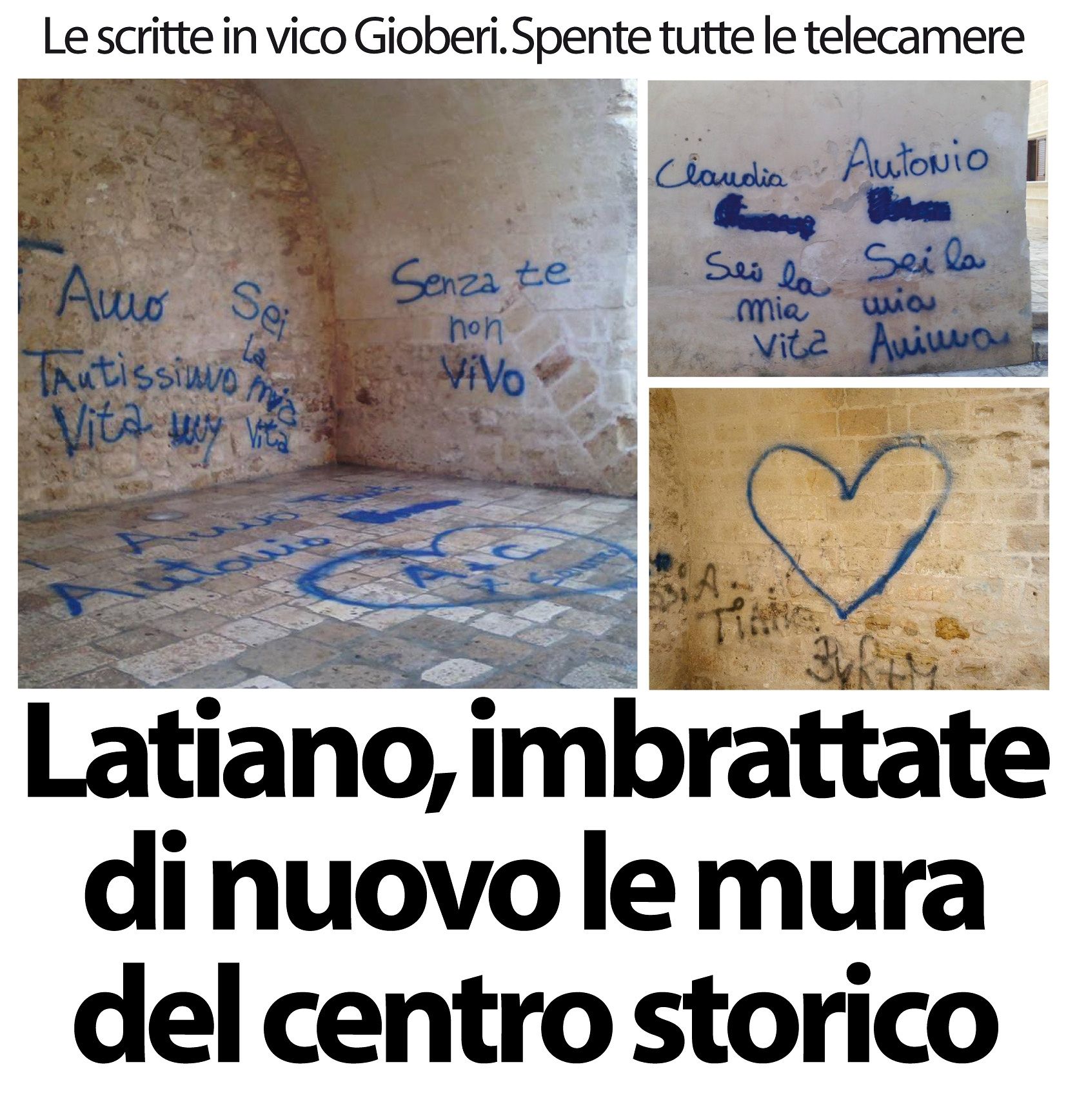 Nel centro storico di Latiano, ormai, la piaga del graffitismo vandalico è una croce con cui i cittadini, quelli civili, devono fare i conti da anni. Oggi sono riapparse le scritte sulle mura laterali di Palazzo Imperiali in vico Gioberti. La colpa? Di qualche ragazzetto che ha voluto inviare, nella maniera sbagliata, messaggi d’amore alla sua fidanzata. Di più: le telecamere che sono installate su tutta la piazza, e che avrebbero potuto inchiodare i vandali, non sono funzionanti.