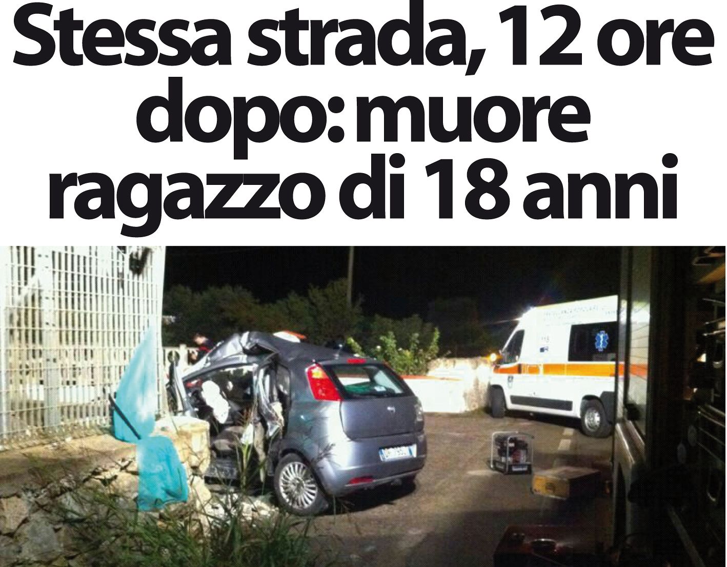 Stessa strada, dodici ore dopo: Pietro Loparco, 18 anni, di San Vito dei Normanni, è morto stamattina alle 4 lungo la Brindisi-San Vito. La sua auto, una Fiat Punto, è finita contro un muretto a secco in contrada Conforto, forse a causa dell’asfalto bagnato. Ieri pomeriggio, poco lontano, aveva perso la vita Gianpiero Palazzo, schiantatosi con la sua moto. Loparco, che era reduce da un sabato sera trascorso con gli amici, è morto sul colpo: per estrarlo dalle lamiere è stato necessario l’intervento dei vigili del fuoco. Le indagini sono condotte dai carabinieri.
