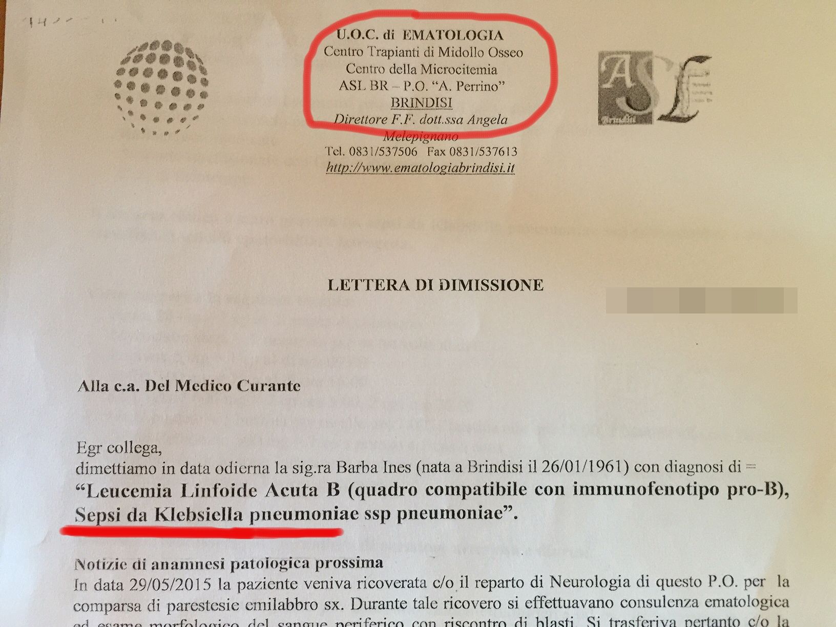 Eccola la parola maledetta, che emerge per la prima volta da un referto medico dell’ospedale “Perrino” di Brindisi: sono stati gli stessi medici di Ematologia, dimettendo una prima volta Ines, a indicare la presenza dell’infezione.