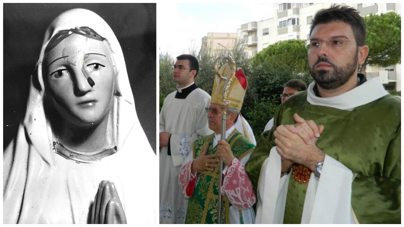Il 23 agosto 1988 la comunità mesagnese è al centro di una breve ma intensa esperienza mistica. Nella casa della famiglia di Pino “il pollaro”, venditore al mercato del paese, si verificano eventi inspiegabili. Una statuetta della Madonna, che si trova accanto a quella di un Gesù coronato, inizia a lacrimare sangue (nella foto un momento di quella lacrimazione). La gente, come accade spesso in questi casi, grida al miracolo e si comincia a radunare e a pregare chiedendo grazia alla Madonna. Il fenomeno si esaurisce in pochi giorni e qualcuno lo collega con la contrastata vocazione sacerdotale del quattordicenne Francesco Caramia, che papà Pino vorrebbe proseguisse gli studi e magari trovasse un lavoro meno faticoso di quello del commerciante. Ma lui vuole a tutti i costi diventare sacerdote. La madonnina non lacrimerà più ma tornerà spesso nella vita di quel ragazzino, determinato a diventare Don.
