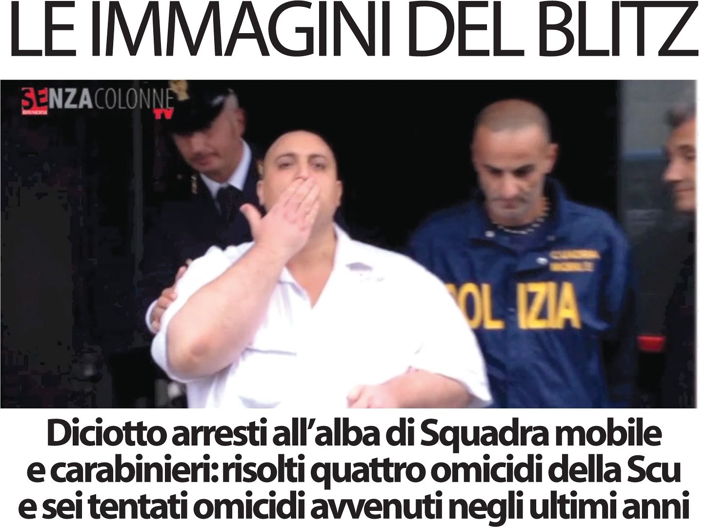 Sono 18 le ordinanze di custodia cautelare in carcere notificate questa mattina da Polizia e Carabinieri, principalmente a Mesagne, ma anche a Brindisi e Ostuni ad altrettanti indagati per 4 omicidi e 6 tentati omicidi a marchio Scu commessi tra il 1997 e il 2010. Tra i nomi di spicco quello di Francesco Campana, 40 anni di Mesagne, capo della frangia brindisina, arrestato nel 2011 nel suo covo a Oria dopo una lunga latitanza. Nel corso dell’operazione denominata “Zero” gli agenti della Squadra mobile di Brindisi hanno tratto in arresto Marcello Cincinnato, 46 anni di Mesagne, Francesco Gravina detto “Gabibbo”, 34 anni di Mesagne, Franco Locorotondo, 39 anni di Mesagne, Salvatore Solito, 31 anni di Mesagne. Operati dai carabinieri gli arresti di Diego Dello Monaco, 30 anni di Mesagne, Antonio Epicoco, 39 anni di Brindisi, Giuseppe Locorotondo, detto “Peppe Lambretta”, 40 anni di Mesagne, Carmelo Vasta, 35 anni di Ostuni. Gli altri arrestati sono Ronzino De Nitto, 38 anni di Mesagne, Francesco Argentieri, detto “Francescone” o “Mago”, 39 anni di Mesagne, Carlo Cantanna, detto “Caccavella”, 62 anni di San Vito dei Normanni, Giovanni Colucci detto “il professore”, 41 anni di Ostuni, Carlo Gagliardi, 38 anni di Mesagne, Francesco Gravina detto “Chicco Pizzaleo”, 53 anni di Mesagne, Emanuele Guarini detto “Braciola”, 39 anni di Mesagne, Massimo Pasimeni, 45 anni di Mesagne, Vito Stano, 44 anni di Mesagne.