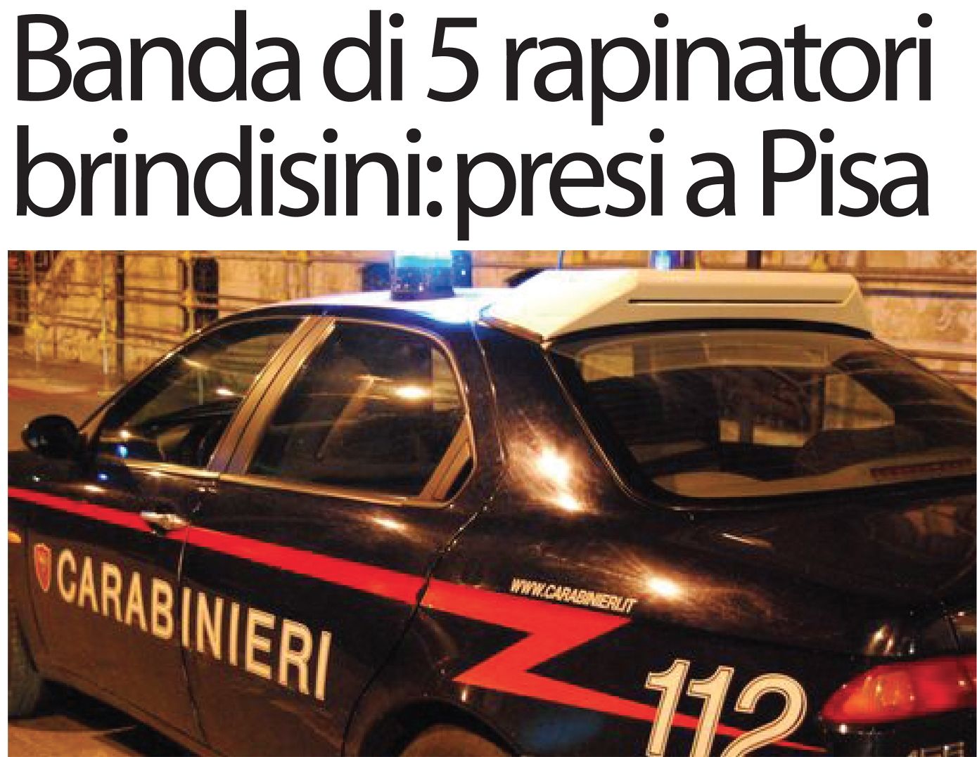 Rapinatori di strada, armati di tutto punto, che agivano in trasferta, in Toscana. In particolare nel Pisano. Sono cinque e tutti di Brindisi gli uomini arrestati dai carabinieri della compagnia di Pontedera, le cui indagini sono partite da un assalto a un’area di servizio di Ponsacco, messo a segno il 21 agosto scorso.Si tratta di Andrea Russo 21 anni, Damiano Russo 30 anni, Manuel Camarda 27 anni, Antonio Delle Grottaglie 18 anni e Nicola Totaro, 83 anni, difesi dagli avvocati Raffaele Missere e Giuseppe Pomarico.