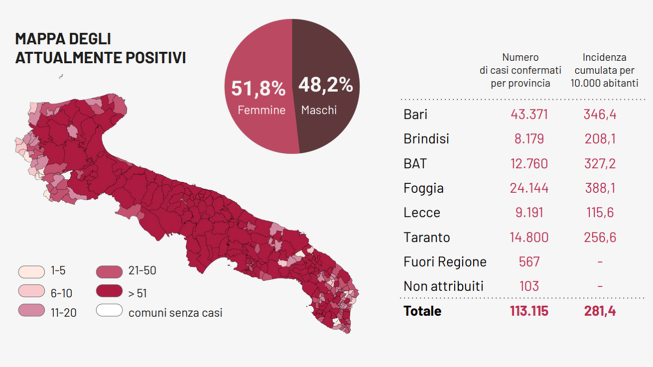 Oggi giovedì 21 gennaio 2021 in Puglia, sono stati registrati 11.524 test per l’infezione da Covid-19 coronavirus e sono stati registrati 1.275 casi positivi (11%, ieri era 10%): 478 in provincia di Bari, 63 in provincia di Brindisi, 92 nella provincia BAT, 294 in provincia di Foggia, 138 in provincia di Lecce, 207 in provincia di Taranto, 4 residenti fuori regione. 1 caso di provincia di residenza non nota è stato riclassificato e attribuito.