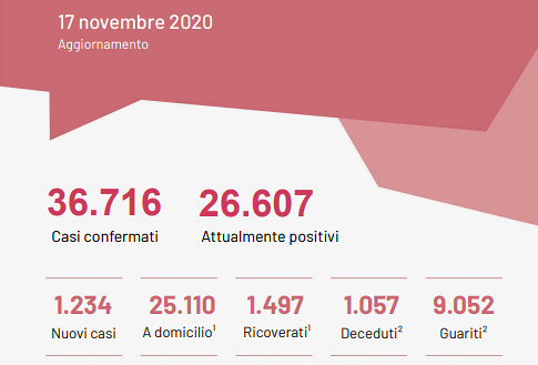 Oggi martedì 17 novembre 2020 in Puglia, sono stati registrati 6.228 test per l’infezione da Covid-19 coronavirus e sono stati registrati 1.234 casi positivi: 495 in provincia di Bari, 88 in provincia di Brindisi, 124 nella provincia BAT, 182 in provincia di Foggia, 94 in provincia di Lecce, 245 in provincia di Taranto, 7 residenti fuori regione, 1 caso di provincia di residenza non nota è stato riclassificato e attribuito.