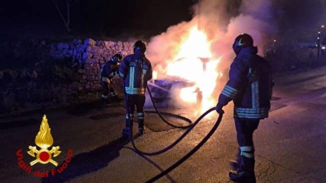 La squadra dei Vigili del Fuoco del Distaccamento di Ostuni è intervenuta in quanto un’automobile ha preso fuoco a seguito dell’impatto con un muretto a secco.
