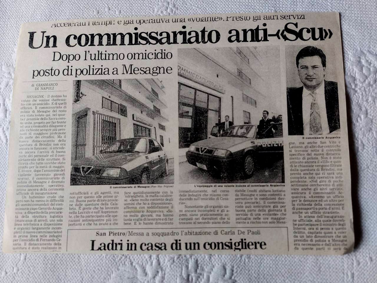 “No, iniziammo con tre agenti inviati da Roma, poi qualche ispettore. Eravamo davvero in pochi. La svolta arrivò circa un mese dopo l’apertura del Commissariato, quando venne trovato in campagna, alla periferia di Mesagne, un vigilante: crivellato di colpi e poi bruciato nel cofano della sua auto. In quel momento dal ministero capirono che la battaglia sarebbe stata durissima e che servivano uomini e mezzi adeguati. E così avvenne”.
