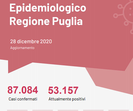 Oggi lunedì 28 dicembre 2020 in Puglia, sono stati registrati 4.147 test per l’infezione da Covid-19 coronavirus e sono stati registrati 645 casi positivi (15,5%): 219 in provincia di Bari, 30 in provincia di Brindisi, 18 nella provincia Bat, 269 in provincia di Foggia, 86 in provincia di Lecce, 16 in provincia di Taranto, 4 residenti fuori regione, 3 casi di provincia di residenza non nota.