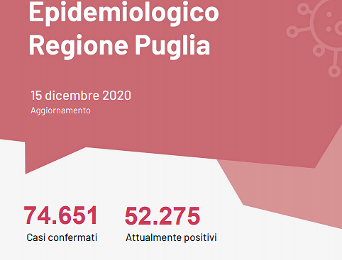 Oggi martedì 15 dicembre 2020 in Puglia, sono stati registrati 10.163 test per l’infezione da Covid-19 coronavirus e sono stati registrati 1.023 casi positivi: 367 in provincia di Bari, 122 in provincia di Brindisi, 104 nella provincia BAT, 145 in provincia di Foggia, 146 in provincia di Lecce, 129 in provincia di Taranto, 8 residenti fuori regione, 2 casi di provincia di residenza non nota.