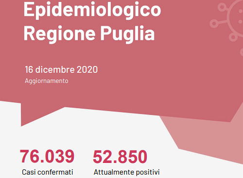 Oggi mercoledì 16 dicembre 2020 in Puglia, sono stati registrati 10.188 test per l’infezione da Covid-19 coronavirus e sono stati registrati 1.388 casi positivi (13,6%): 547 in provincia di Bari, 90 in provincia di Brindisi, 219 nella provincia Bat, 242 in provincia di Foggia, 142 in provincia di Lecce, 142 in provincia di Taranto, 1 residente fuori regione, 5 casi di provincia di residenza non nota.