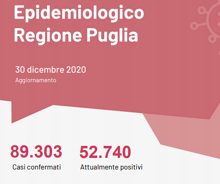 Oggi mercoledì 30 dicembre 2020 in Puglia, sono stati registrati 11.121 test per l’infezione da Covid-19 coronavirus e sono stati registrati 1.470 casi positivi (13,2%): 582 in provincia di Bari, 38 in provincia di Brindisi, 188 nella provincia Bat, 256 in provincia di Foggia, 148 in provincia di Lecce, 248 in provincia di Taranto, 5 residenti fuori regione, 5 casi di provincia di residenza non nota.