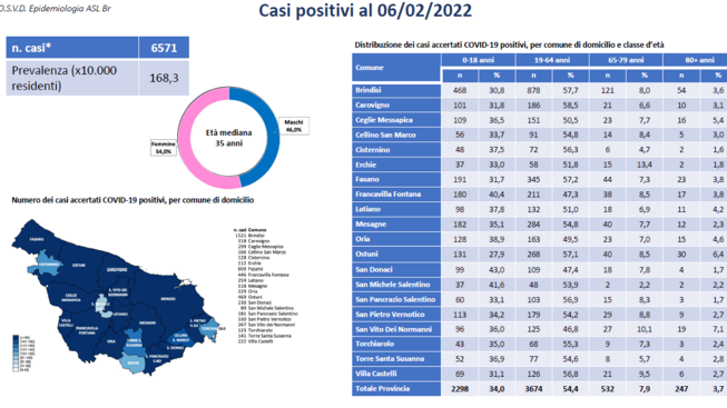 Per quanto riguarda la distribuzione per Comune i positivi sono 1.521 a Brindisi, 603 a Fasano, 518 a Mesagne, 469 a Ostuni, 446 a Francavilla Fontana, 330 a San Pietro Vernotico, 329 a Oria, 318 a Carovigno, 299 a Ceglie Messapica, 267 a San Vito dei Normanni, 259 a Latiano, 230 a San Donaci, 222 a Villa Castelli, 181 a San Pancrazio Salentino, 166 a Cellino San Marco, 141 a Torre Santa Susanna, 128 a Cisternino, 123 a Torchiarolo, 112 a Erchie, 89 a San Michele Salentino. I Comuni della provincia di Brindisi con i maggiori valori di incidenza cumulativa sono, nell’ordine, Torchiarolo, Brindisi, Oria, Villa Castelli.