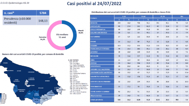 Per quanto riguarda la distribuzione per Comune i positivi sono 1.297 a Brindisi, 658 a Fasano, 512 a Francavilla Fontana, 449 a Mesagne, 383 a Ostuni, 306 a San Vito dei Normanni, 272 a Ceglie Messapica, 259 a Carovigno, 211 a Latiano, 193 a San Pietro Vernotico, 191 a Cisternino, 170 a Torre Santa Susanna, 169 a Oria, 143 a Villa Castelli, 125 a Erchie, 108 a Cellino San Marco, 100 a San Donaci, 82 a San Pancrazio Salentino, 80 a San Michele Salentino, 76 a Torchiarolo. I Comuni della provincia di Brindisi con i maggiori valori di incidenza cumulativa sono, nell’ordine, Torchiarolo, Oria, Brindisi, Cellino San Marco.