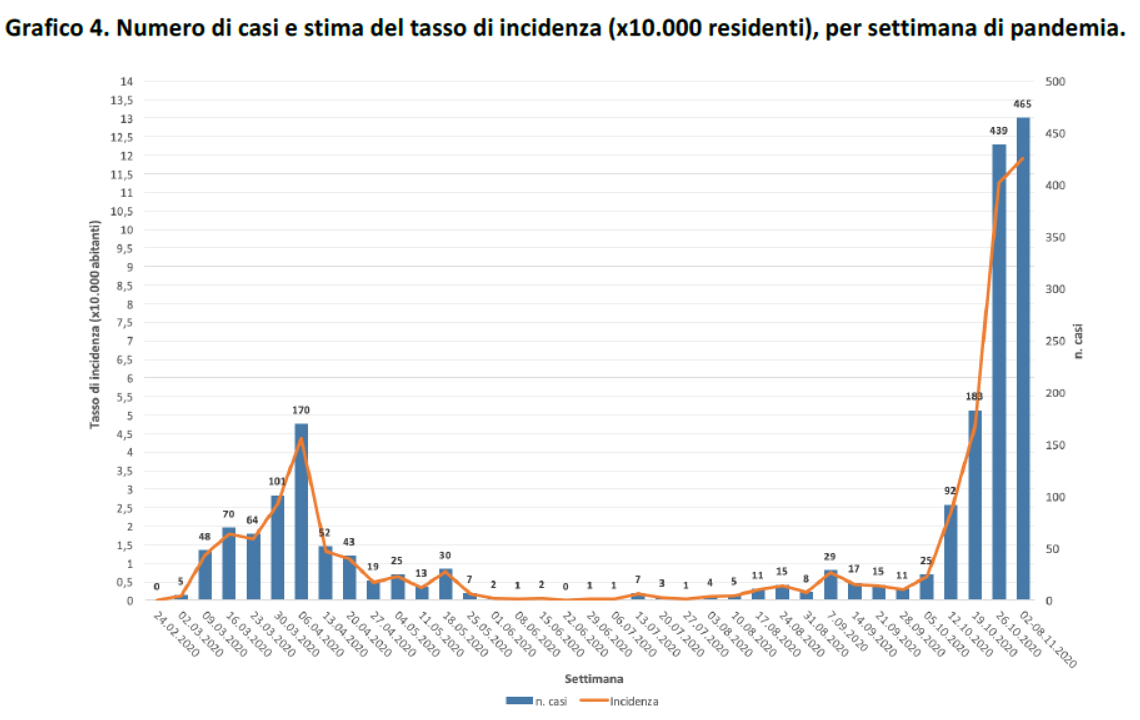 Tra il 24 febbraio e l’8 novembre sono 1.983 i casi confermati: nella fascia di età 0-9 anni sono 97 i positivi; 162 in quella 10-19 anni; 242 nella fascia 20-29 anni; 247 nel range 30-39; 312 in quello 40-49 anni; 346 tra i 50 e 59 anni; 244 tra i 60 e 69 anni; 170 tra i 70 e 79 anni; 126 tra gli 80 e gli 89 anni, 37 nella fascia di persone con età pari o superiore a 90 anni. Sono 74 i decessi totali: 58 casi tra le persone che hanno più di 70 anni; 9 tra i 60 e 69 anni, 6 casi tra i 50 e i 59 e 1 nella fascia 30-39.
