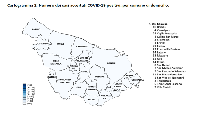 Per quanto riguarda la distribuzione per Comune i positivi sono 29 a Fasano, 24 a Ceglie Messapica, 23 a Francavilla Fontana, 14 a Latiano, 14 a Ostuni, 13 a Mesagne, 12 a Oria, 11 a San Pietro Vernotico, 10 a Brindisi, 7 a San Michele Salentino, 7 a Villa Castelli, 5 a San Pancrazio Salentino, 5 a Torre Santa Susanna, 4 a Carovigno, 4 a Cellino San Marco, 4 a Cisternino, 4 a Erchie, 3 a Torchiarolo, 1 a San Vito dei Normanni, 0 a San Donaci. I Comuni della provincia di Brindisi con i maggiori valori di incidenza cumulativa sono, nell’ordine, Brindisi, Francavilla Fontana, Torre Santa Susanna, Oria.