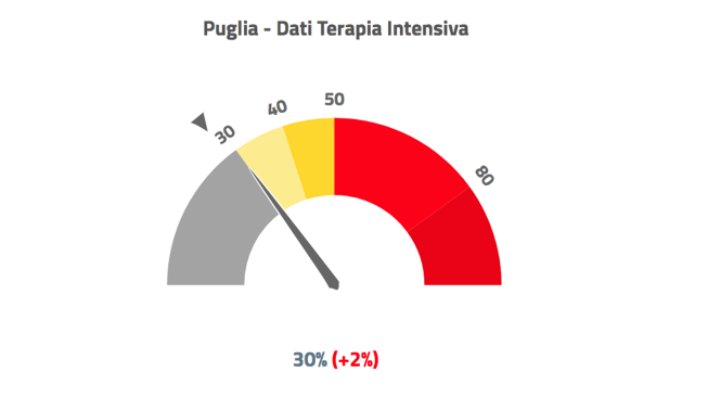 Nelle terapie intensive della Puglia è stata raggiunta la «soglia critica» di occupazione dei posti letto pari al 30%: lo rileva il report di Agenas, l’Agenzia nazionale per i servizi sanitari regionali, nel suo ultimo monitoraggio effettuato ieri sera. Mentre, nell’area non di Medicina Covid (pneumologia e malattie infettive) il tasso di occupazione dei posti letto è del 34%, sotto di sei punti percentuali rispetto al limite fissato dal ministero della Salute al 40%. Quello del numero dei pazienti ricoverati nelle strutture sanitarie è uno dei parametri utilizzati ogni settimana per l’attribuzione delle zone di rischio.