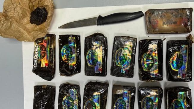 L’accurato controllo del domicilio ha permesso di recuperare nel vano congelatore del frigorifero ben 13 panetti di hashish, un altro piccolo pezzo della stessa sostanza stupefacente avvolta da carta forno per un peso complessivo di circa 700 grammi ed un coltello da cucina con evidenti tracce di droga.