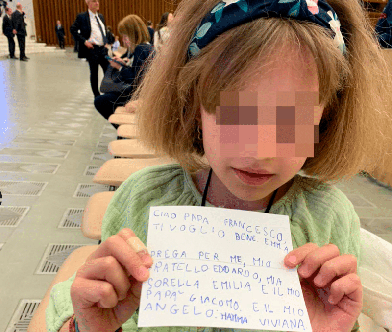 Ciao papa Francesco, ti voglio bene. Prega per me, mio fratello Edoardo, mia sorella Emilia, il mio papà Giacomo e il mio angelo mamma Viviana. Emma”: lei sorride mentre consegna il bigliettino scritto con la calligrafia incerta di una bambina di sei anni nelle mani del pontefice che percorre in carrozzella un tratto dell’immensa aula Paolo VI del Vaticano. Emma ha solo sei anni, ma è destinata a crescere in fretta, forse più rapidamente dei suoi coetanei, nonostante il papà Giacomo Cofano stia cercando di farle vivere con spensieratezza questo periodo difficilissimo. Emma a dicembre ha perso la mamma, Viviana Delego, con la quale aveva condiviso amorevolmente quel pancione che cresceva con i due fratellini che stavano per venire al mondo. Ora è il suo angelo.