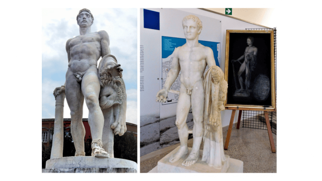 Il fatto che la statua donata a Roma abbia la clava in mano e non i pomi delle Esperidi come quella che vediamo oggi al museo è perché a quell’epoca, l’unica immagine che ispirò l’autore era quella riveniente dal dipinto settecentesco che lo raffigura in quel modo in quanto nessuno di quella generazione aveva mai visto l’originale segregato nei depositi napoletani.