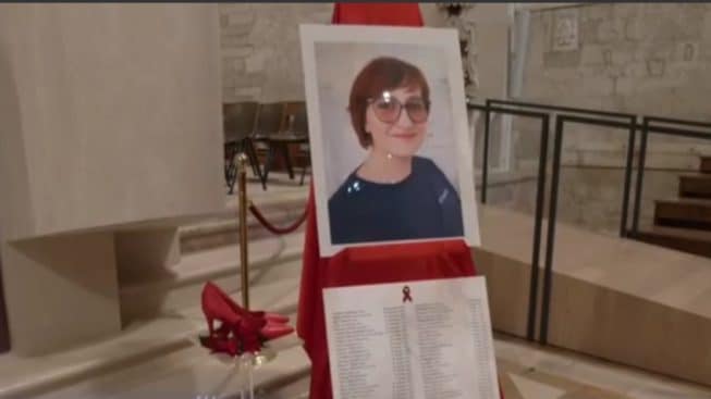 Accanto all’altare erano stati posizionati un paio di scarpe rosse, simbolo principale del contrasto alla violenza contro le donne, una immagine di Enza e l’elenco delle vittime di femminicidio dall’inizio dell’anno ad oggi. Anche gli operatori del servizio di onoranze funebri hanno voluto testimoniare la vicinanza alla causa appuntando alla divisa il fiocchetto rosso e disegnandosi il graffio rosso sulla guancia.
