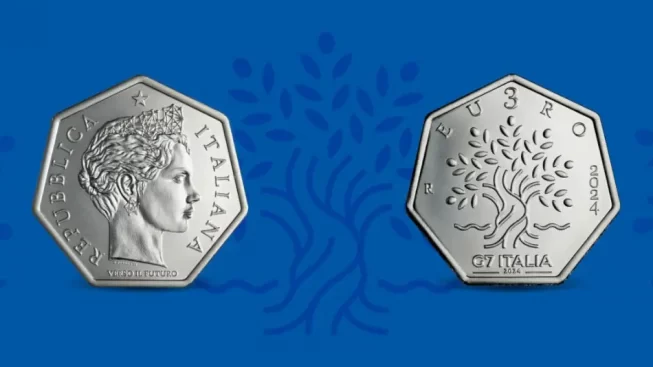 È stata emessa dal Ministero dell’Economia e delle Finanze, con l’Istituto Poligrafico e Zecca dello Stato, una nuova moneta in argento, da collezione, per celebrare la settima presidenza italiana del G7: ha forma ettagonale e valore nominale di tre euro ed è stata prodotta con una tiratura di 4.000 pezzi. Si tratta di un pezzo creato dal maestro incisore Emanuele Ferretti, del quale reca la firma sul lato dritto, insieme alla scritta “Repubblica Italiana” e al monito “Verso il futuro”. Sul retro è invece rappresentato un ulivo, logo di questa edizione del vertice a marchio pugliese.