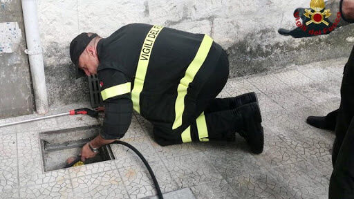 Per portare a buon fine l’intervento si è reso necessario lo smontaggio di un pluviale, l’apertura di un tombino e l’utilizzo di aria compressa e naspetto per indirizzare il gattino verso l’uscita. A supporto è stata utilizzata anche la telecamera a sondino per individuare la posizione del felino nei vari spostamenti.