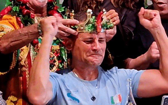 Il titolo, di cui va orgogliosissimo, si aggiunge all’altro conquistato pochi giorni prima a Jesi, in provincia di Ancona, dove si è disputata la finale di un altro campionato nazionale, quello di Mangiatori Super Hot, condotto da Giancarlo Gasparotto, in arte Jack Pepper, Guinness dei Primati dei Mangiatori di Peperoncino, Campione Europeo e detentore della League Of Fire European Belt.