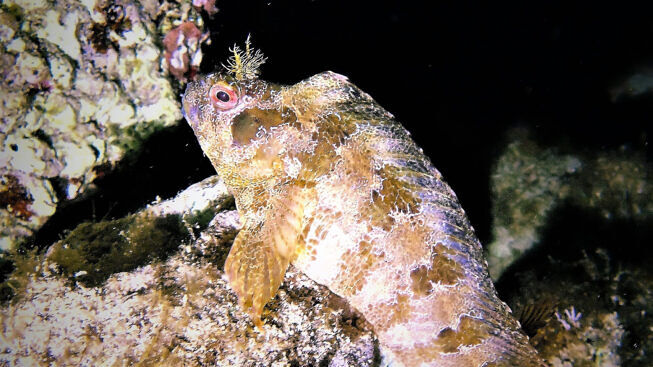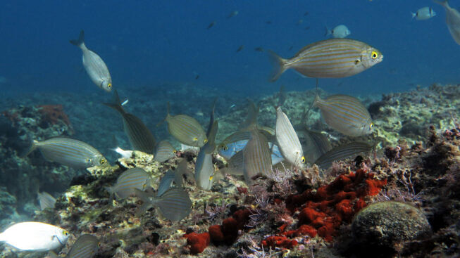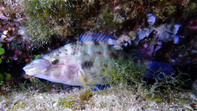Essendo questi i miei pensieri, non riesco ad astrarmi dal contesto per concentrarmi unicamente sulle creature marine che incontro sulla via del ritorno: nuvolette di castagnole, gruppetti di donzelle, qualche tordo pavone, un polpo ormai prossimo all’accoppiamento, le immancabili salpe che brucano la vegetazione che ha colonizzato le parti più luminose della scogliera, una quantità enorme di piccoli gamberetti trasparenti che attirano piccoli predatori e, quando siamo già in prossimità dell’ingresso al canalone che ci porta al punto di partenza, una giovane corvina argentea e gialla, che, subito, si nasconde nella sua tana, senza nemmeno darmi il tempo di immortalarla in uno scatto.