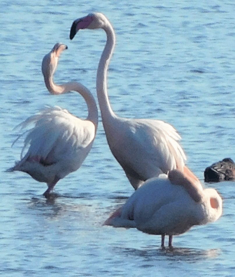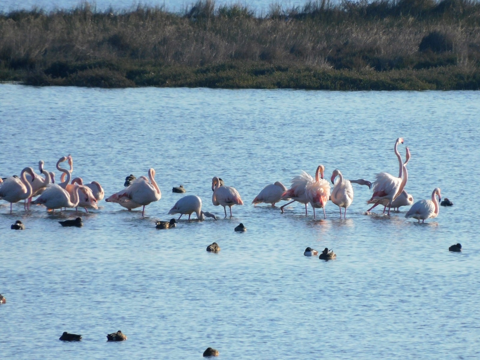 Ho il pregio di assistere – anche se ciò non dovrebbe accadere in inverno e non è un bene che accada in questa stagione, ma la temperatura primaverile che permane da settimane e l’inverno che non si decide ad arrivare stanno traendo in inganno sia la flora che la fauna mediterranea – alla cosiddetta danza dei fenicotteri, un rituale pre-accoppiamento primaverile, in cui maschio e femmina si corteggiano e posizionandosi l’uno di fronte all’altra con i loro sinuosi colli vengono a formare un grande cuore rosa. Ho cercato zoomando al massimo l’obiettivo della mia fotocamera di poter riprendere in qualche scatto tale rituale, anche se la distanza da cui mi trovavo era quasi proibitiva.