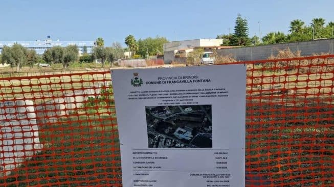 Lavori in corso a Francavilla Fontana: l’amministrazione comunale ha avviato il cantiere lavori che trasformerà in un piccolo campus sportivo l’area esterna condivisa tra i plessi “Collodi” e “Falcone e Borsellino” del Primo Istituto Comprensivo in via Suor Antonietta Zullino. L’intervento è finanziato con 525 mila euro provenienti dal Fondo nazionale per la promozione del Sistema integrato Zerosei.