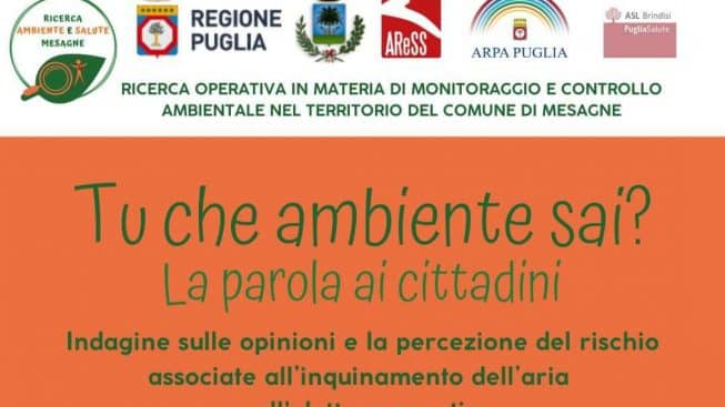 Il Comune di Mesagne, in collaborazione con Regione Puglia, AreSS (Agenzia Regionale per la Salute e il Sociale), ARPA Puglia (Agenzia Regionale per la Prevenzione e la Protezione dell’Ambiente) e Asl Brindisi nell’ambito del progetto “Ambiente e Salute”, sta realizzando una ricerca operativa in materia di monitoraggio e controllo ambientale sul territorio di Mesagne.